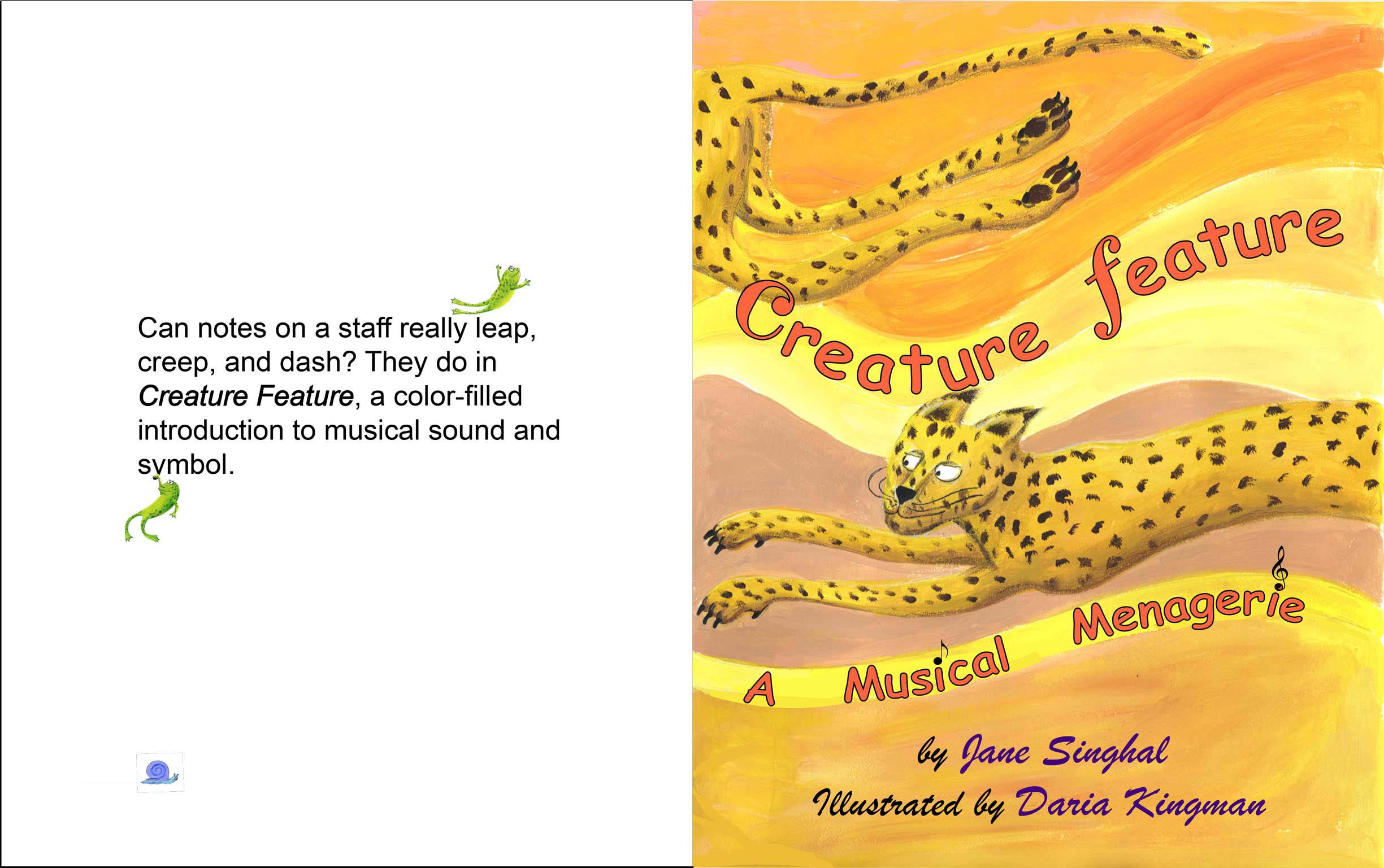 Can notes really leap, creep, and dash? They do in Creature Feature, a unique introduction to the nuts and bolts of music for children. Cheetah, gorilla, frolicking frogs and other creature teachers demonstrate some of music's special effects— dynamics, tempo, articulation, register and melodic motion— and introduce the symbols of standard musical notation.