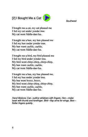 Hand Motions: Cat—outline whiskers with fingers. Hen—make
